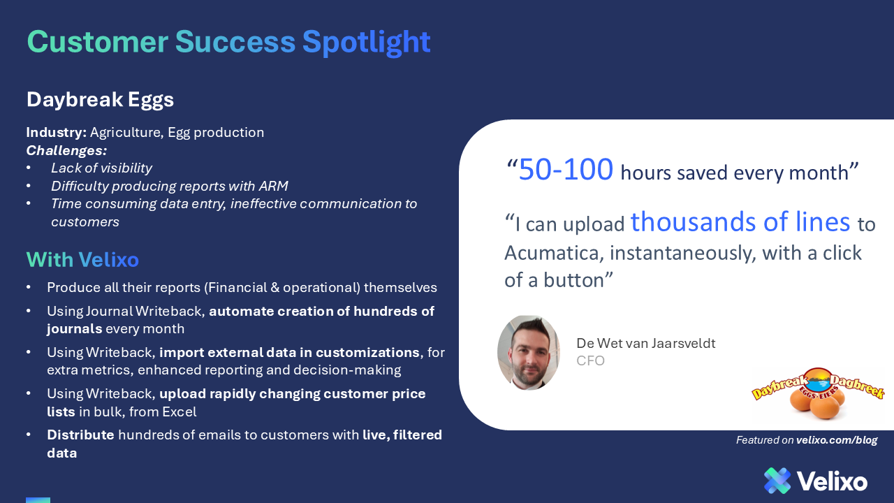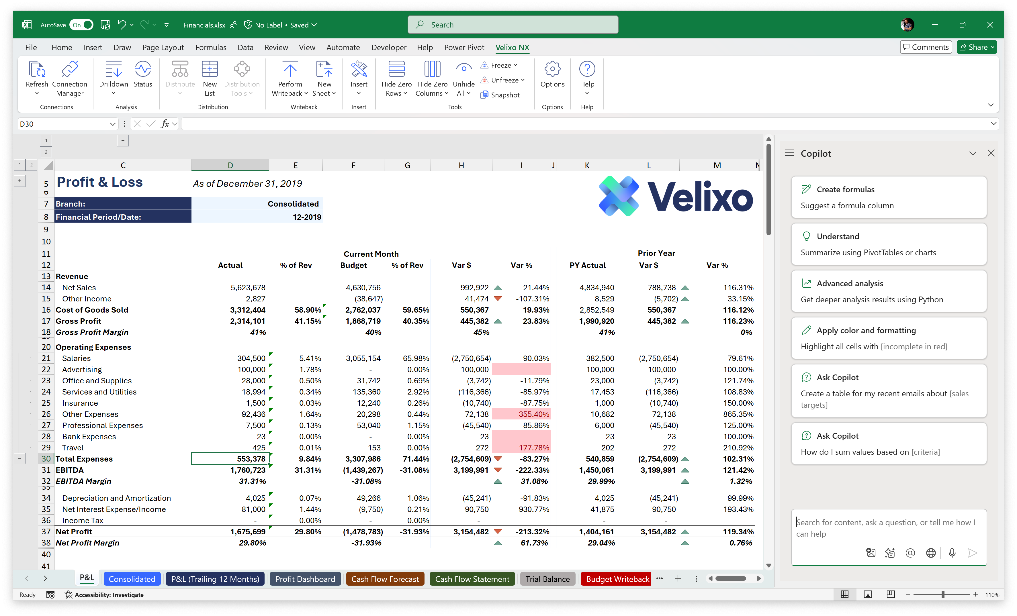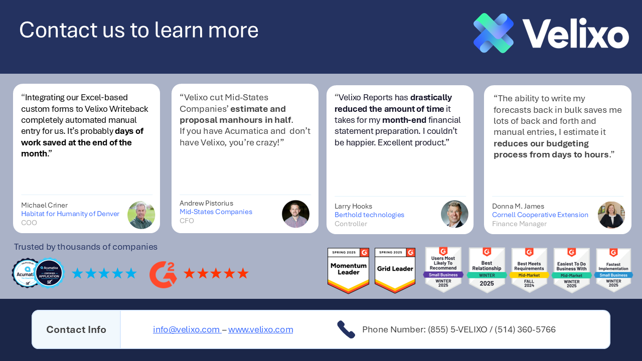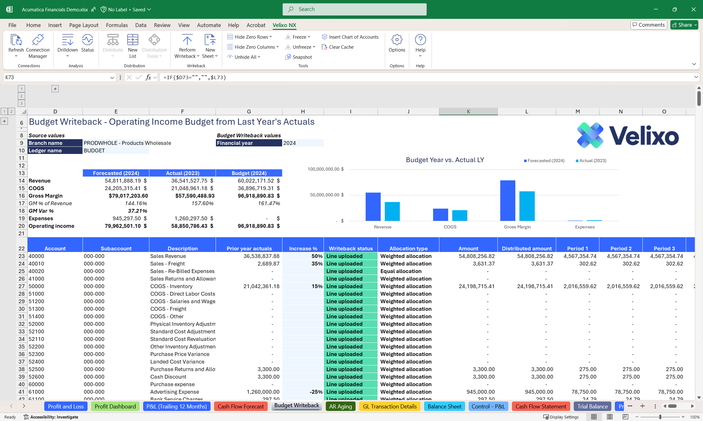 Velixo es un moderno software de elaboración de informes, presupuestos y automatización de datos que se integra perfectamente con Acumatica desde Excel, en tiempo real.